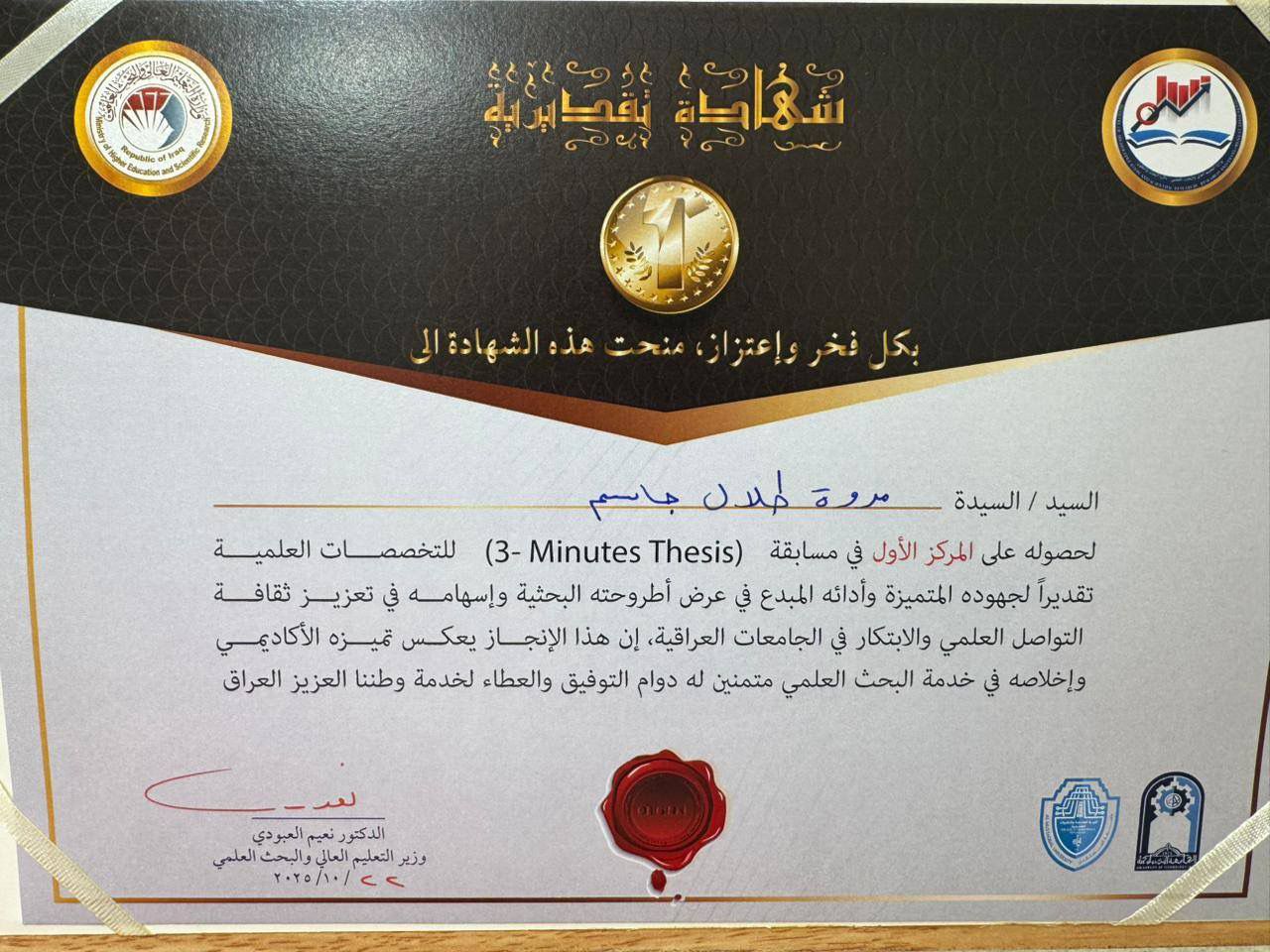 جامعة تكريت تحصد المركز الأول في مسابقة “3-Minutes Thesis” للتخصصات العلمية على مستوى العراق
